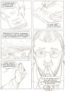 esboço a lápis que fiz para a minha adaptação do conto "a sociedade" do livro "brás, bexiga e barra-funda", de antônio de alcântara machado, para a editora "escala educacional". as anotações em algumas páginas, são orientações feitas por mim para bruno brazão, indicado pela editora para finalizar os traços e cores.